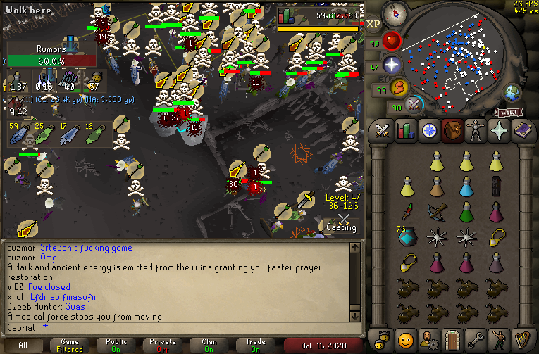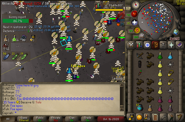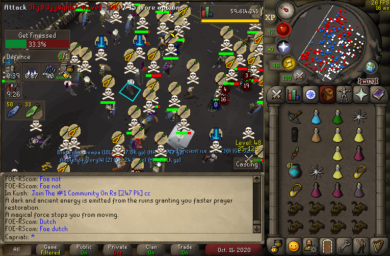 Sunday, October 11th: Final Ownage Elite massed up 75 Elites for our scheduled P2P Trip. Today we reminded the pure scene why we are the best pure clan in Old School Runescape history. No matter what obstacle is thrown our way we conquer it. Knowing that we have the strongest memberbase and core in the game, we quickly tele'd to GDZ and waited for whatever clan mustered up enough courage to fight us. We waited several minutes strategically spread west of GDZ before Zenith hopped in and gave us our first action of the day.
