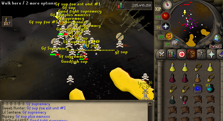 About an hour into our PK trip, we ran into Supremacy around sperm hill. Being down opts, ~15 FOE vs 20+ Supremacy, we knew we were in for a good fight. We dragged Supremacy to CA and waited a few minutes for more eagles to fly in.