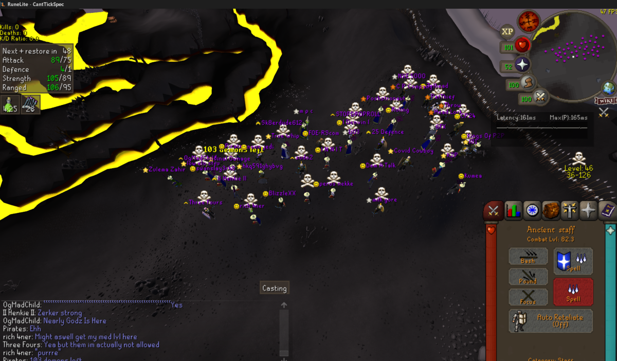 We got word that bp were fighting at gdz, and so we tele'd in and fought them at white plat. Rage tried rushing once again with their 10 man pull, causing little consequence. We dragged the fight west where fatality once again failed another hit. This time, they couldn't tele out. They got in massive clumps yet again which we cleared up within seconds. After embarrassing them for the third time, we got a bank and went back up to the cluster at gdz. We cleared up the pures there until it was infested with mains. Unsurprisingly, Fi didn't try again this time.